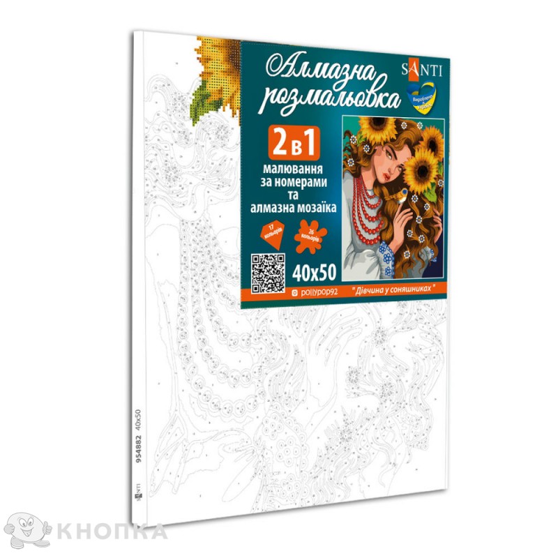Створіть власний шедевр завдяки унікальному набору для творчості, який об'єднує два популярних хобі. Полотно комбінованої алмазної мозаїки потрібно частково розмалювати акриловими фарбами, а також частково заповнити кольоровими камінцями і це надасть вашій роботі неймовірний 3D-ефект. Ваша власна майстерність об'єднає алмазні камінці та акрилові фарби, створюючи твір мистецтва, який прикрасить ваш інтер'єр. Ваше мистецтво - це ваша унікальність. Картина за номерами з алмазною мозаїкою SANTI Дівчина у соняшниках @pollypop92 Зверніть увагу! Кольори акрилових фарб та камінців можуть відрізнятися від зображених на фото в залежності від налаштування вашого монітора. Склад набору: Полотно з клейкою основою для викладки мозаїки на дерев'яному підрамнику. Контрольний аркуш для точного розміщення камінців. Круглі акрилові камінці. Акрилові пронумеровані фарби для розмалювання. Набір пензлів для точного нанесення фарб. Олівець для захоплення каменів (стілус), пластиковий піддон для камінців та силіконовий клей.
