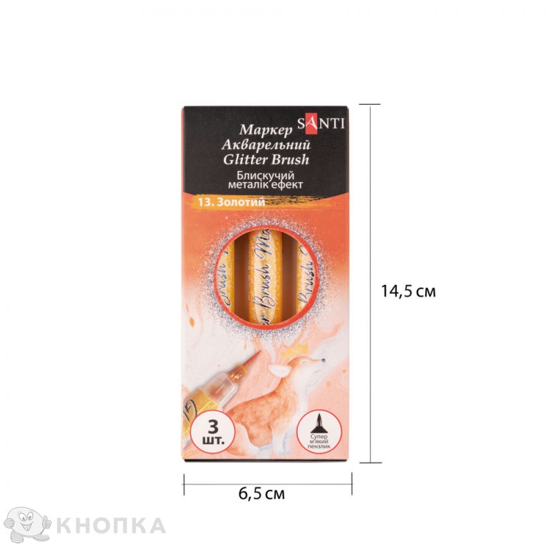 Маркери акварельні SANTI "Glitter Brush" ідеально підходять для виконання художніх робіт у різних техніках, включаючи скетчінг та ілюстрування. Гнучкий наконечник у формі пензлика підходить для малювання штрихів змінної товщини та зафарбовування. Чорнило на водній основі. Упаковка: 3 шт. Корпус виготовлений з поліпропілену.