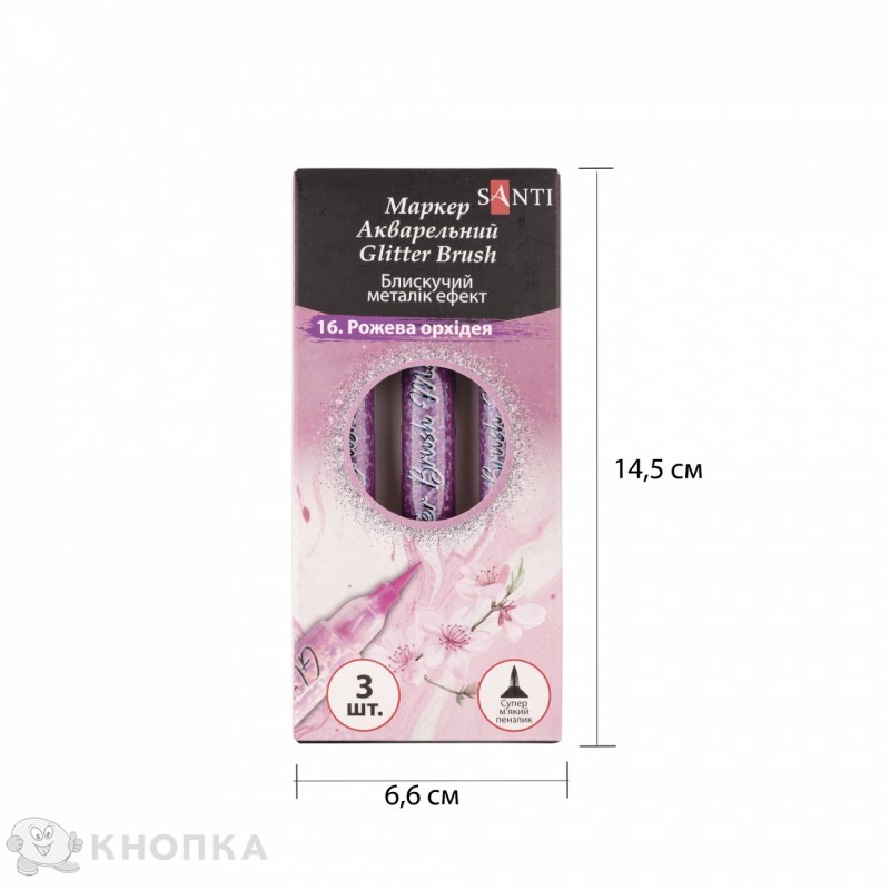 Маркери акварельні SANTI "Glitter Brush" ідеально підходять для виконання художніх робіт у різних технiках, включаючи скетчiнг та ілюстрування. Гнучкий наконечник у формі пензлика підходить для малювання штрихів змінної товщини та зафарбовування. Чорнило на водній основі. Упаковка: 3 шт. Корпус виготовлений з поліпропілену.