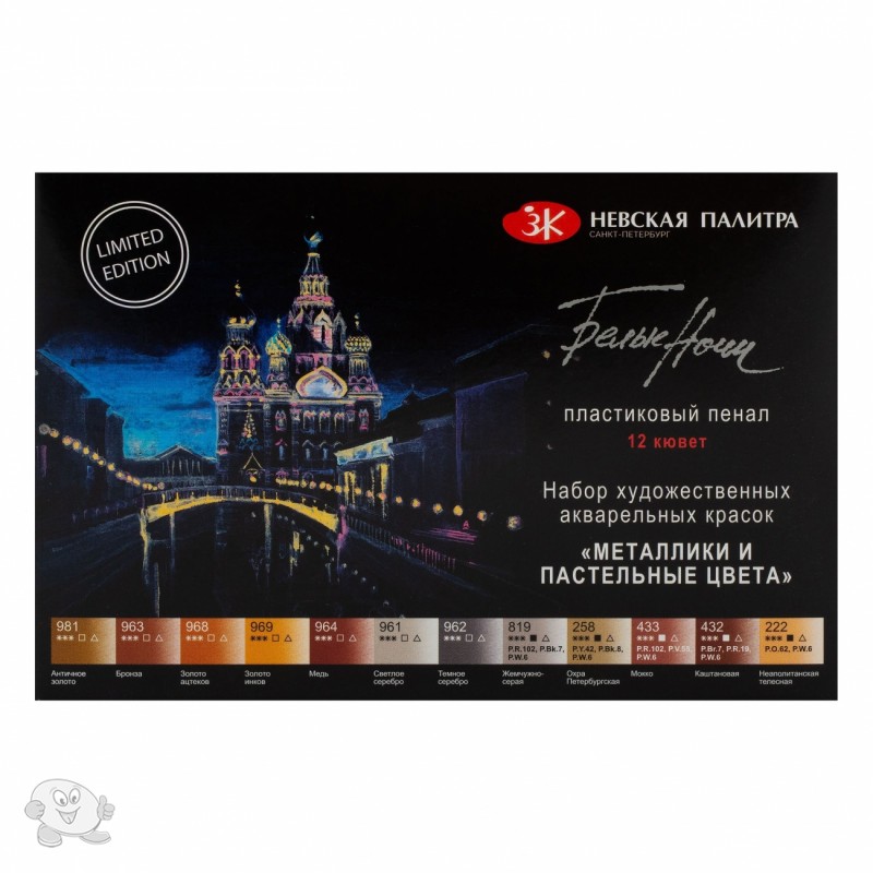 Набор акварельных красок "Белые ночи", 12 цветов по 2,5 мл. Профессиональные художественные акварельные краски серии «Белые ночи» представляют собой тонкодисперсные суспензии светостойких пигментов и наполнителей в связующем, в состав которого входит водный раствор растительного клея – гуммиарабика. Все это обеспечивает их высокое качество и возможность использования в ответственных работах.