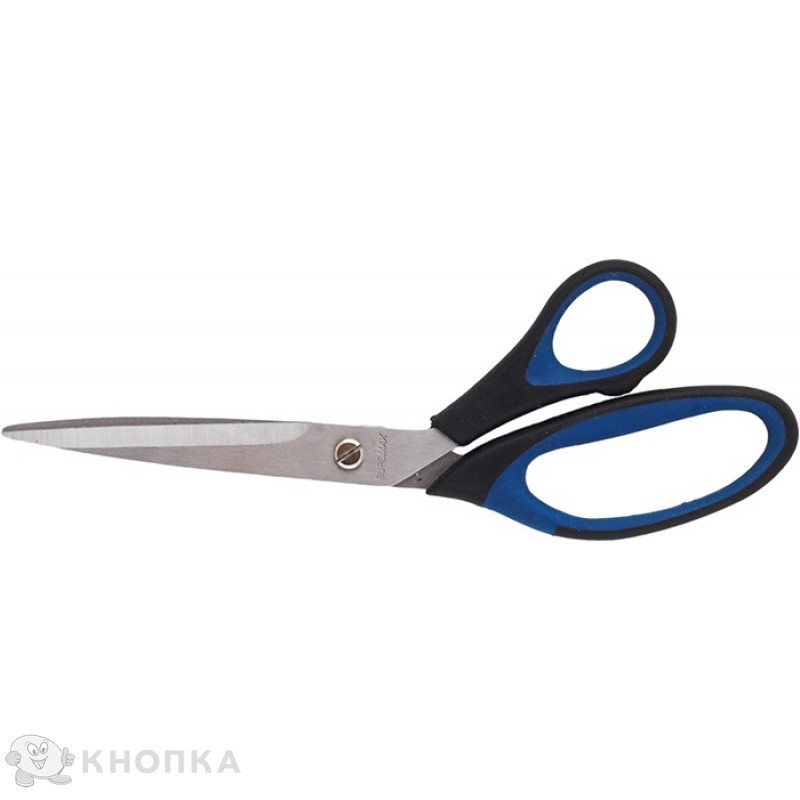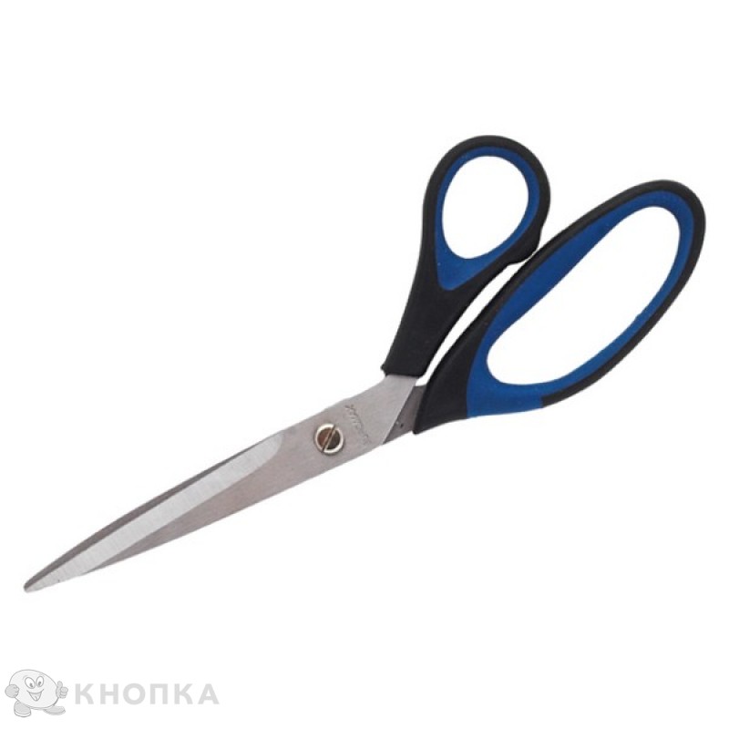 Ножницы офисные. Лезвия изготовлены из стали, острые. Пластиковые эргономичные ручки с резиновыми вставками, очень удобны в работе. Крепление лезвий - заклепка. Рекомендовано для использования дома и в офисе.
