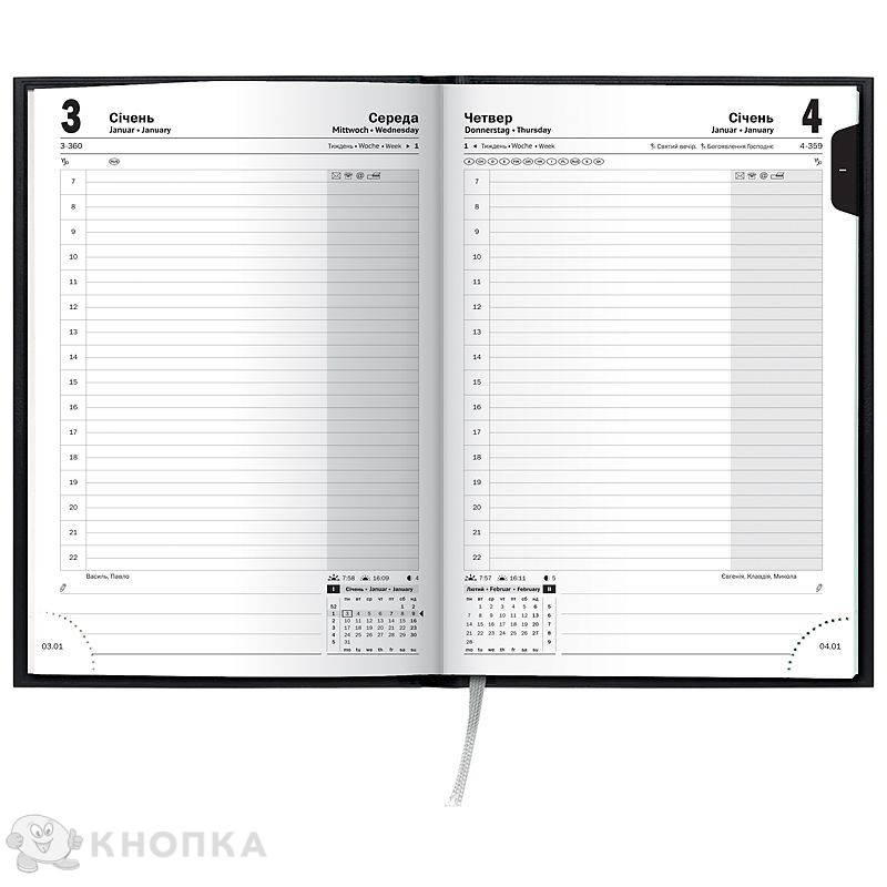 Датаванный дневник BRUNNEN Стандарт Miradur 2024 с/т – маст-хев активного успешного человека. Примерная классика в современном исполнении. Содержит продуманное рабочее пространство в формате «день на странице» с удобным организатором времени. Лаконичный стиль линирования и четкая разбивка на блоки помогают сконцентрироваться на главном и держать важные задачи в поле зрения. Благодаря отрывным уголкам с датами и аккуратной закладке всегда легко найти актуальную страницу. Особого внимания заслуживает качество изделия: безупречно гладкая белая бумага; трендовая обложка; идеально четкая печать. Особенности: Три языка: украинский, английский, немецкий. Организатор времени с 07:00 до 22:00. Страницы общей планировки на год. Белая европейская бумага 70 г/м2. Закладка-лес и отрывные уголки с датой. Стильная обложка Miradur. Эффектное серебряное тиснение.