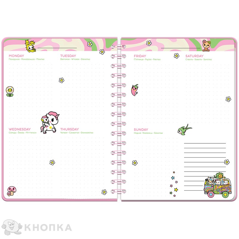 Дневник-планер Kite TK23-438 на спирали – это непревзойденный источник вдохновения, отличный помощник в планировании, безупречное пространство для записи мечтаний и размышлений. Он имеет роскошную отделку в увлекательной лицензии. Твердый переплет будет надежно защищать страницы и долго сохранять безупречный вид. Большое количество качественных цветных иллюстраций будет дарить невероятное эстетическое наслаждение. Крепление страниц на спирали – очень практично и удобно: дневник можно раскрывать под любым углом, не повреждая переплет. Эластичная резинка фиксирует обложку и защищает от нежелательного вскрытия дневника. Планер имеет 5 различных дизайнов периодически повторяющихся недель. Поля для расписания и развороты с охватом недели удобны для планировки и стильно украшены. В специальном кармане можно хранить записки, открытки, наклейки и другие «сокровища». Два листа с уникальными тематическими стикерами для хорошего настроения и эффектного декорирования дневника. Роскошный дневник-планер Kite – это вдохновляющий и оригинальный подарок, о котором мечтает каждый ребенок. Он будет ежедневно дарить хорошее настроение, прививать изысканный вкус и помогать планировать дела. Особенности: уникальный вдохновляющий дизайн – много ярких иллюстраций и неординарное убранство каждой страницы; невероятно популярная лицензия tokidoki – настоящее сокровище для ценителей популярного лайфстайла; твердая обложка из плотного картона – практичная и стильная; содержит 138 качественных страниц с удобной линией и оригинальным оформлением; крепление на крепкой пластиковой спирали – можно открывать под любым углом; два листа креативных стикеров-наклейок для отделки; лаконичная резинка – для надежной фиксации дневника.