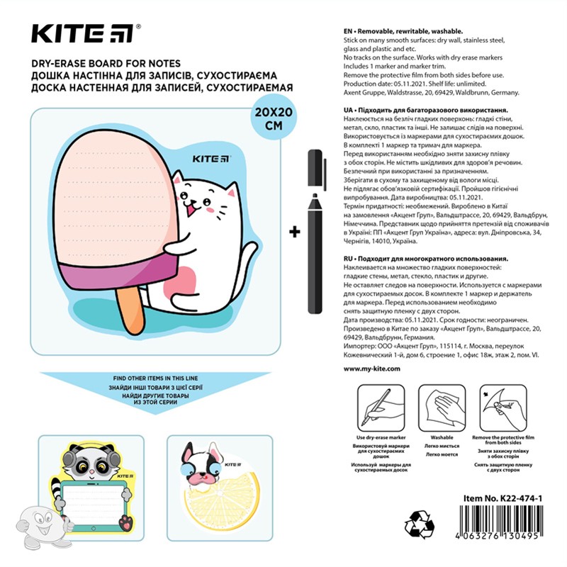 Настенная доска для записей Kite K22-474-1 Ice Cream напомнит о важных событиях и вдохновит успех в ежедневных делах. Фигурная настенная доска Kite – невероятно удобное пространство для планирования и бесконечный источник вдохновения. Сюда можно записывать предстоящие планы и краткие заметки; оставлять для близких милые послания и рисовать забавные картинки. Жизнерадостный дизайн с милым котенком будет ежедневно дарить улыбки и заряжать на позитив. Дети будут в восторге от такого интересного и полезного подарка. Доска пригодится для обучения и развлечения. Напомнит взять «сменку» на физкультуру, подскажет номера задач по математике, не даст забыть о дне рождения любимого кота. Доска предназначена для многократного использования на постоянной основе. Надписи специальным сухостирающим маркером легко удаляются обычной губкой. Это можно повторять нескончаемое количество раз. Доска крепится к стене, холодильнику или другой гладкой поверхности: металлической, стеклянной, пластиковой и т.д. Она надежно фиксируется, не содержит клея и не оставляет никаких следов. В комплекте есть сухостиральный маркер и держатель для удобного крепления. Внимание! Перед использованием необходимо снять защитную плёнку с обеих сторон доски. Особенности: размер: 20х20 см – идеально для ежедневных заметок; легко писать и легко вытирать надписи салфеткой, губкой или тряпкой; надежно крепится к любой гладкой поверхности, не содержит клея и не оставляет следов; многократное использование – можно перемещать множество раз без потери свойств и даже мыть водой; крутой фигурный дизайн – источник положительных эмоций и стильное украшение интерьера; супер-подарок и необходимая вещь для каждого школьника.