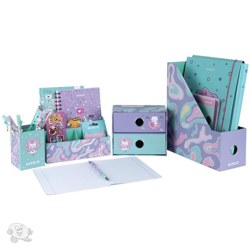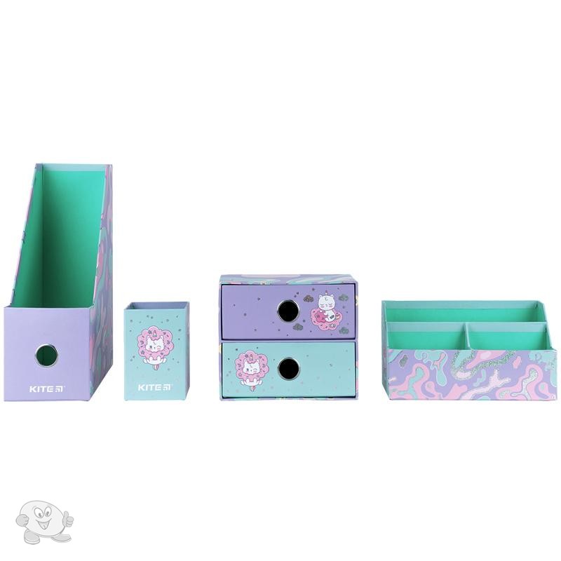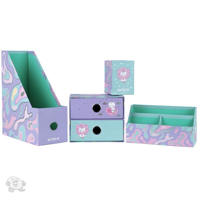 Органайзер настольный (4 предмета) предназначен для хранения канцелярии и мелочей. Особенности: лоток для канцелярских принадлежностей - 10,8*25.5*30 см; подставка для мелочей – 21.4*9.5*11.4 см; стакан для ручек – 8*8*11.5 см; мини-комод с двумя выдвижными ящиками для мелочей – 18*9.8*15 см; материал – уплотненный картон; яркий трендовый дизайн Kite. упаковка: пластиковый бокс с ручкой.