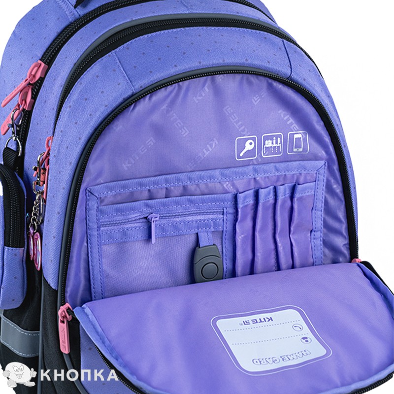 Шкільний рюкзак Kite 700M – ортопедична модель, виконана з міцного поліестеру. Рюкзак схвалений німецьким Інститутом Здоров'я та Ергономіки IGR, рекомендований для дітей зростом 130 – 145 см (6-10 років). Рюкзак зовні: ортопедична спинка Ergo Kids; широкі S-подібні лямки; знімний нагрудний ремінь; передня кишеня – з органайзером, ключницею та плюшевою кишенею для телефона; 2 бічні кишені на гумці для пляшечки з водою або термоса; щільна м'яка ручка-переноска та текстильна ручка-петля; стійке посилене дно з PU-покриттям; надійна фурнітура: блискавки з тактильно приємними пуллерами; світловідбивні елементи з усіх боків; стильний знімний гаманець на карабіні; ефектний декор. Рюкзак всередині: 2 просторі відділення для зошитів і книжок; кишеня для планшета з плюшевою вставкою, що захищає екран від подряпин; міцна брендована підкладка; поле для запису персональних даних; іконки навігації, що підказують призначення кожного відділення та кишені.